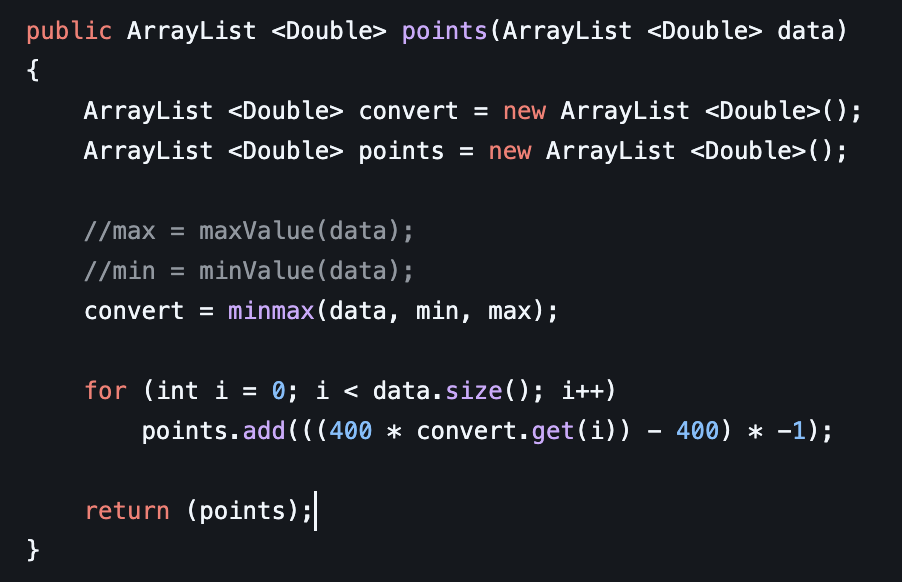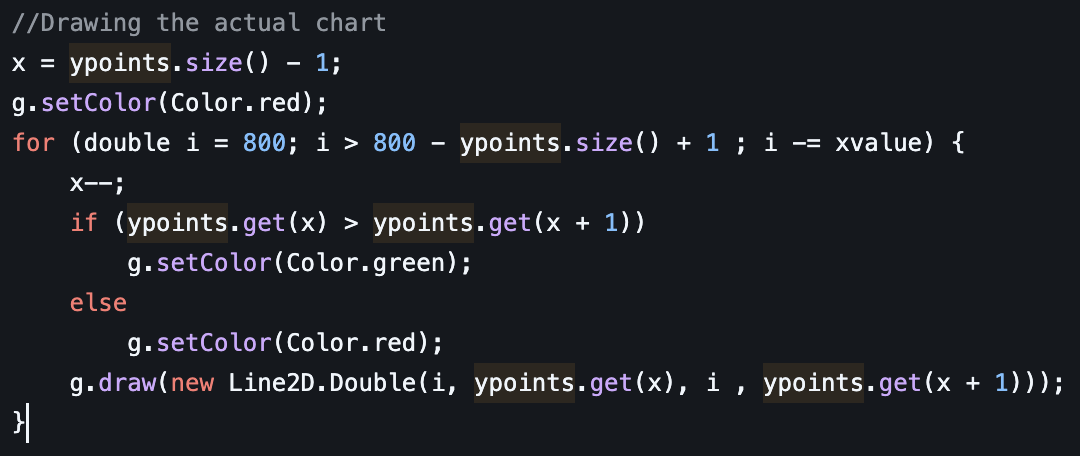 Here we set our graphics drawing to the color red using java libs. We then prepare the for loop to go through 800 points backwards. Notice we are subtracting i from the xvalue we got earlier. Allowing the loop to plot evenly spaced points on the x-axis of the chart. We use an x variable that is the length of the converted points, then start subtracting back from it.
