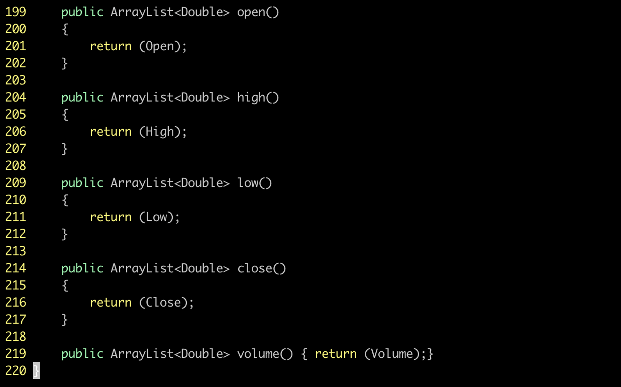 Next we use the .split() function from java to create an array of strings that is pulled where each instance of a "," is. Meaning the string String s = "50,60,70,60,1092" turns into String[] s = {"50", "60", "70", "60", "1092"}. Once we use this built-in java function, we then set our globally declared variables to start adding data with the .add function from a java Arraylist. Once we do that, we use the buff.readLine() function to read the next line from the CSV file. Each line is defined by a '\n' or a new line character.