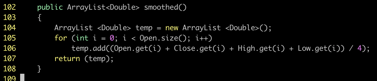 This function adds together the open, high, low, then close. After that, it divides the total by 4, giving a smoothing effect of each line of data needed to analyze further in the program.