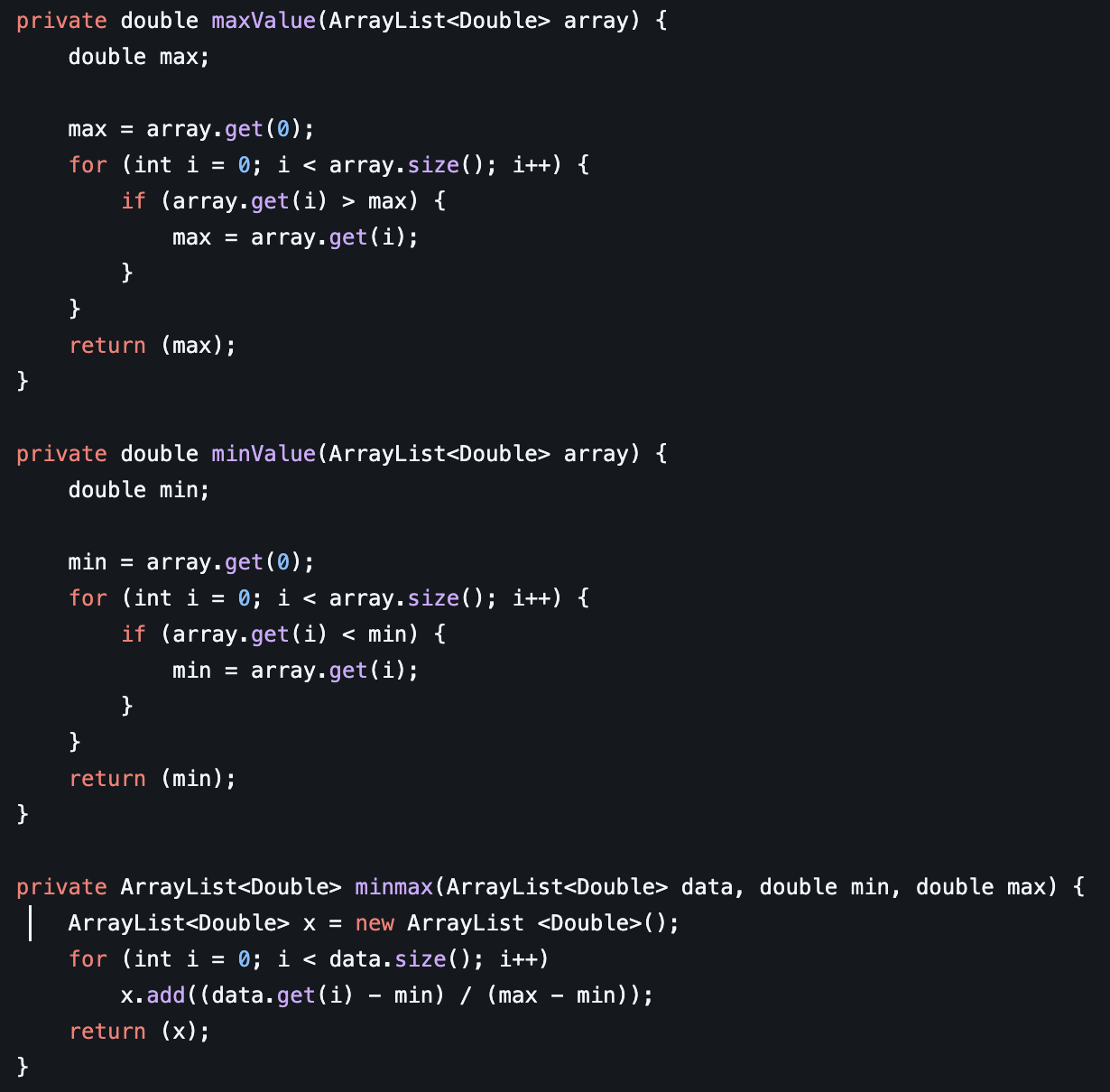 What the minmax function does is it allows us to create a brand-new array of values between 0 - 1. This is essentially turning an array of (0, 1, 2, 3, 4) into (0, 0.25, 0.5, 0.75, 1). This is great as it keeps the ratio of variance between the numbers together while giving us a value that is between 0 and 1. This is important as later in the program we use these points to figure out where on the y-axis we should be plotting each of our data points to construct an accurate model of the stock data.