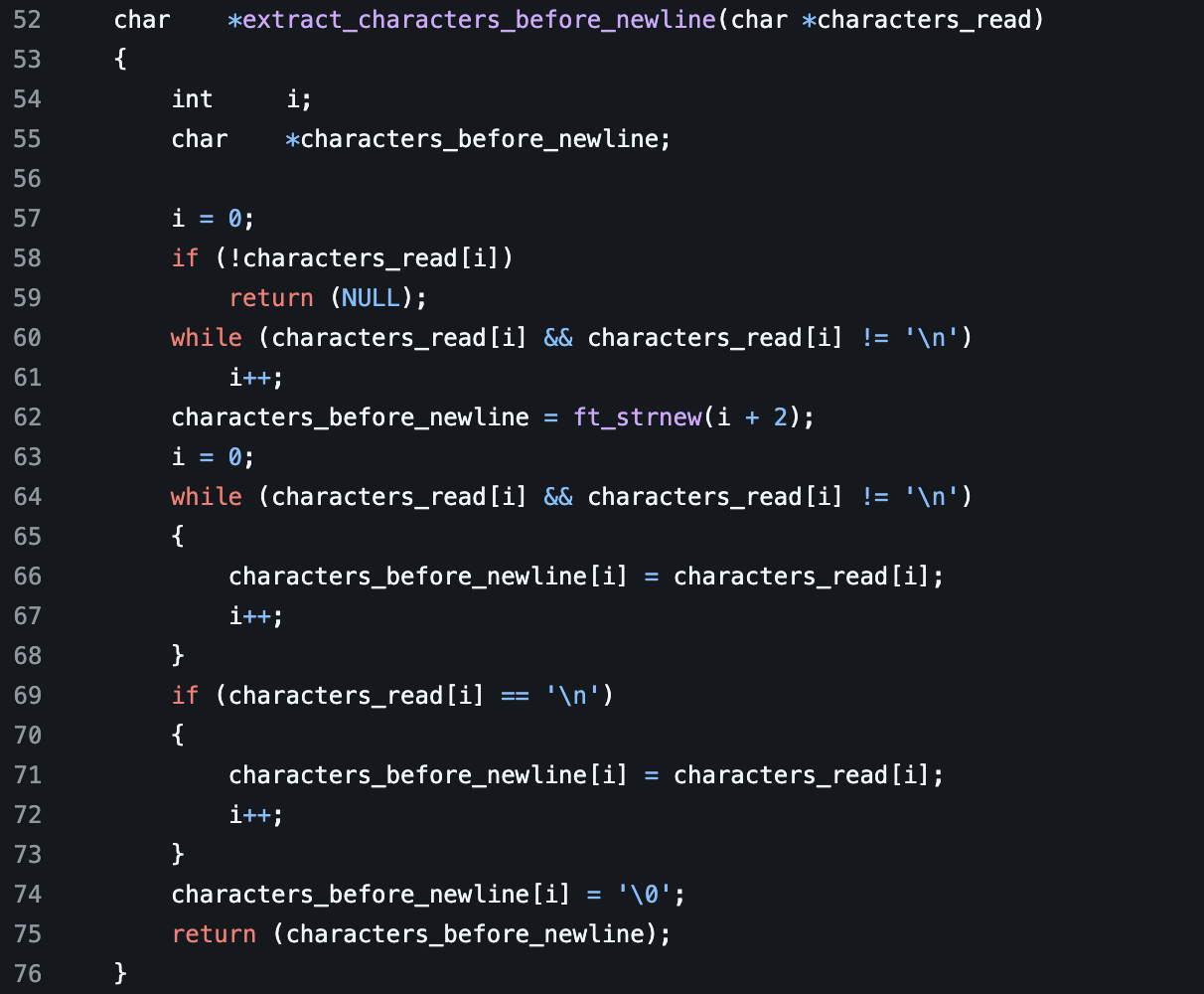 This function returns a character pointer. It takes one parameter that is a character pointer called characters_read. We then declare an integer called i as well as a character pointer called characters_before_newline. After this we initialize the value of i to 0. We then check to to see if the indexed value of characters_read is null. It if is we return null from the function. Next we run a while loop with the conditions of the index value of characters_read not being null and that the indexed value of characters read is not equal to a new line.After this we we initialize characters_before_newline to the return value of ft_strnew with the parameters of i plus two passed. We then initialize the value of i to 0. Next we run a while loop with the same conditions as the first one. In this while loop we set the value of characters_before_newline at the index value equal to the characters_read at the same index value. We then increment i. Next we after this while loop is complete we then check if thee character value of characters_read at the index value of i is equal to a newline. If it is we set characters_before_newline index value equal to the same index value of characters_read. We then increment i. Finally we set the null pointer value of characters_before_newline at the index of i. After this we then return characters_before_newline.