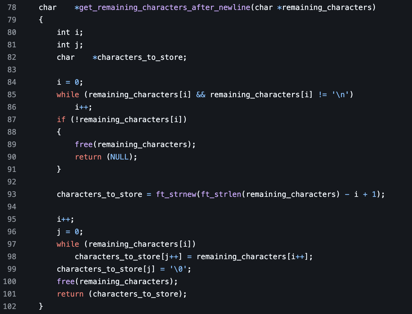 This function returns a character pointer. It takes one parameter that is a character pointer called remaining_characters. We then declare three variables. Two integers called i and j. Then a character pointer called characters_to_store. Next we initialize i to 0. Then we start a while loop with the condition that the indexed value of remaining_characters is not null and the value is not a newline. While this is true we increment the value of i up by one. Next we check if the index value of the remaining_characters is null. If it is, we free the remaining_characters pointer from memory then return null from the function. Next we set characters_to_store equal to the return value of ft_strnew while the parameter of the return value of ft_strlen with remaining_characters as a parameter subtracted by i then plus one. We then increment i by one then set the value of j to 0. Next we run a loop with the condition that the index value of remaining_characters is not null. We then set the index value of j in characters_to_store to the index value of i in remaining_characters. We also increment bot i and j. Then once the while loop is done we set the last indexed value of characters_to_store to a null pointer. We then return characters_to_store.