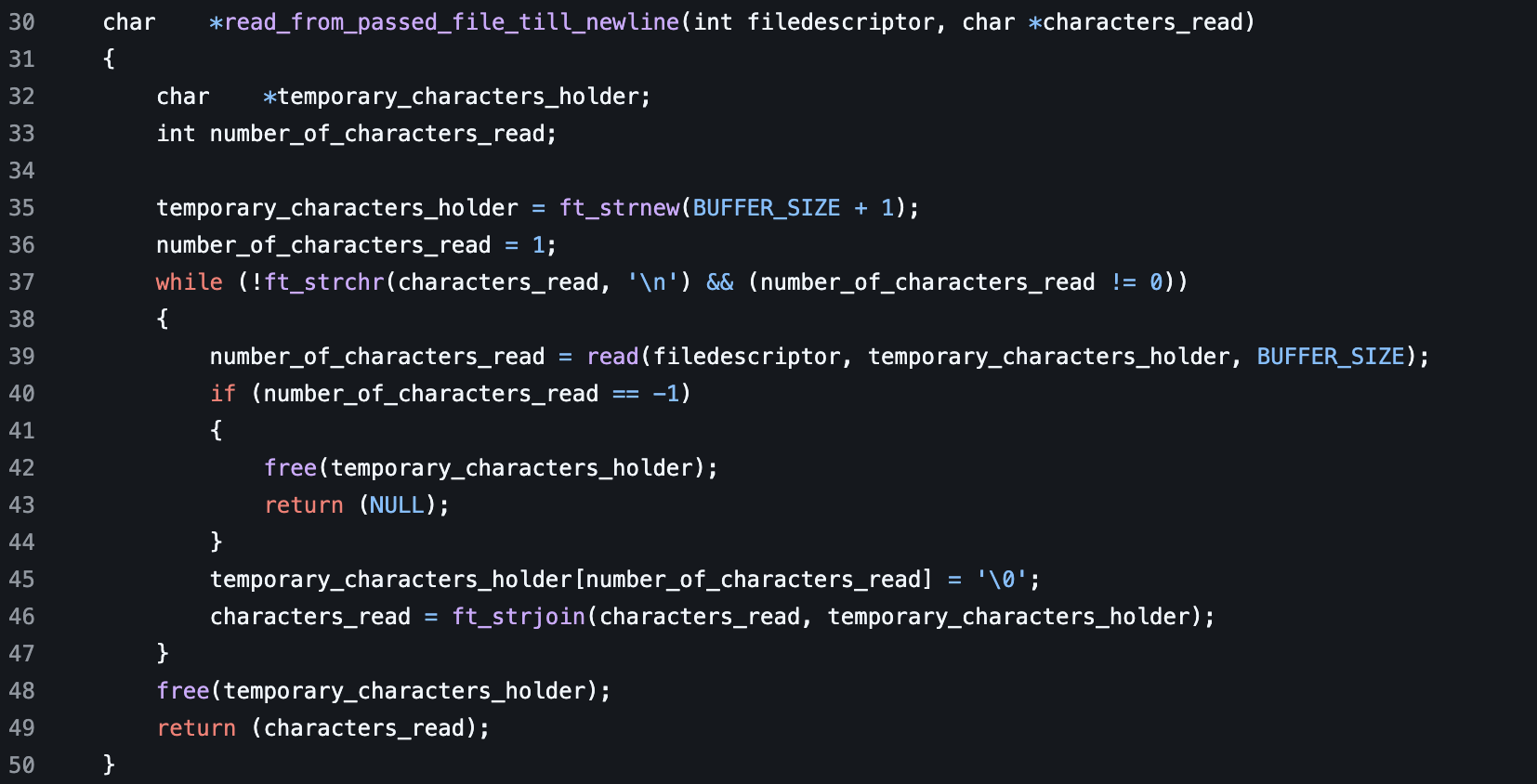 This function returns a character pointer. It takes two parameters. One parameter is an integer called filedescriptor another is a character pointer called characters_read. Next we declare two variables. One character pointer is called temporary_character_holder. Then an integer named number_of_characters_read. Next we initialize temporary_character_holder to equal the return value of ft_strnew with the BUFFER_SIZE + 1. Next we initialize the number_of_characters read to equal one. Next we start a while loop with the condition that ft_strchr with the parameters characters_read and a newline is not true. Meaning that the current character pointer does not contain a new line. And that the number_of_characters read is now equal to 0. Next we set the number_of_characters read equal to the return value of the read function. In the read function we pass three parameters. One is the filedescriptor, another is temporary_characters_holder, then BUFFER_SIZE. We then move forward to check if the number_of_characters_read is equal to negative 1 then we free the temporary_characters_holder. After that we return NULL. if it is not equal to -1, which indicates an error, we then move to set temporary_characters_holder at the index position of number_of_characters_read equal to a null pointer. Then we set characters_read equal to the return value of ft_strjoin with characters_read and temporary_characters_holder as parameter values. Once the while loop is complete we free the memory of the temporary_characters_holder. After this we return characters_read.