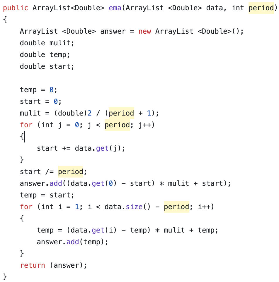 The coding function allows for a data array of stock data along with an integer for a defined period of measurement. It first initializes the mulit variable which gets the weight value for the function. It then calculates the first SMA average, then stores it in the start variable. Then, it loops over the rest of the data, storing each value in the answer array. It then returns the EMA measurements in a data array.