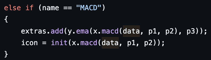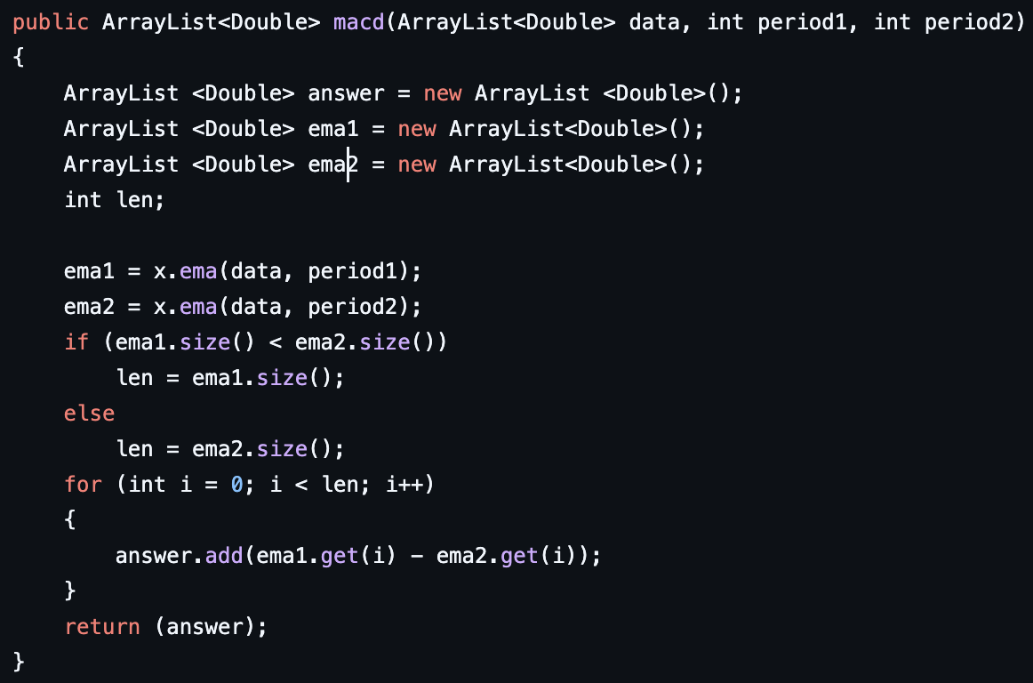 The way this code works is, first you pass in a data array with the 1st then 2nd period as parameters to the MACD function. It then creates two EMA arrays, one from the 1st period and one from the 2nd period using the EMA function described above. It then loops through each array while subtracting the 1st period indexed value from the 2nd period indexed value, then stores the value in an array that it returns. Then to call the MACD, it first creates the signal line by using the returned data array from the EMA function. This returned array from the MACD function is used as a parameter in the ema function with the 3rd period as a parameter. This creates the signal line. After, it then generates the MACD line using the explained function above.