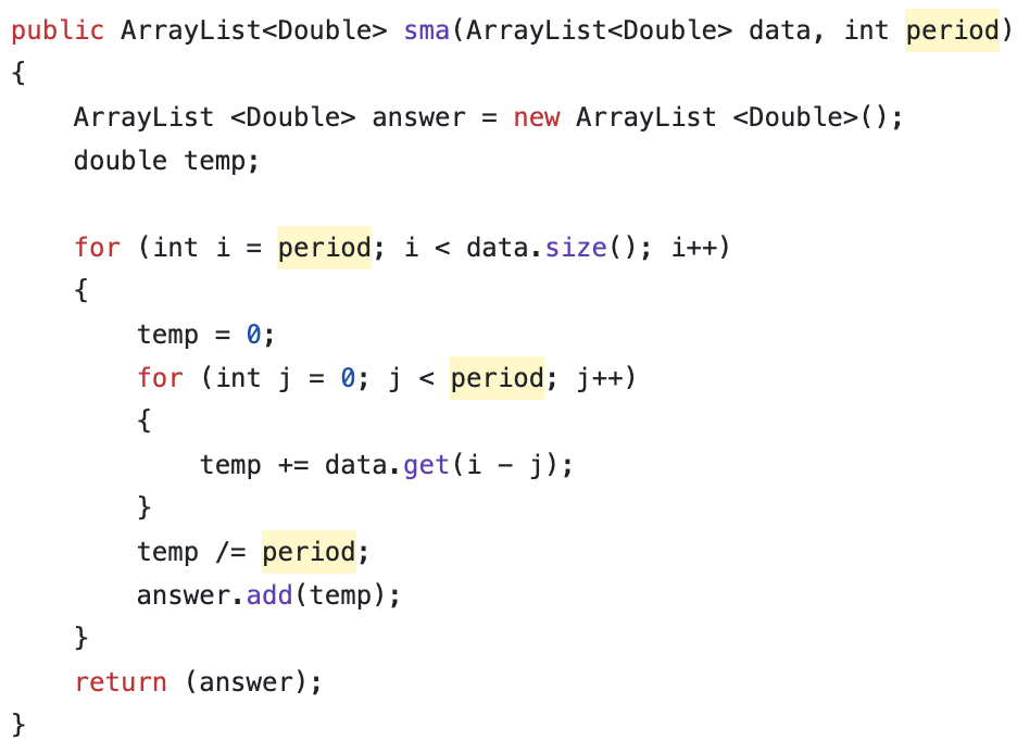 The code here works as follows. The sma method I created takes in an array list along with a integer for the period. It then starts the loop setting i equal to the period. data.size() returns the length of the data array passed in the parameter. Then temp is used to add up all the values between the start as well as end of the period for a particular measurement. After, the temp is then divided by the period to get the same value, which is then stored in the answer array. After the entire data array has been looped through, the answer array is returned with all the SMA data.